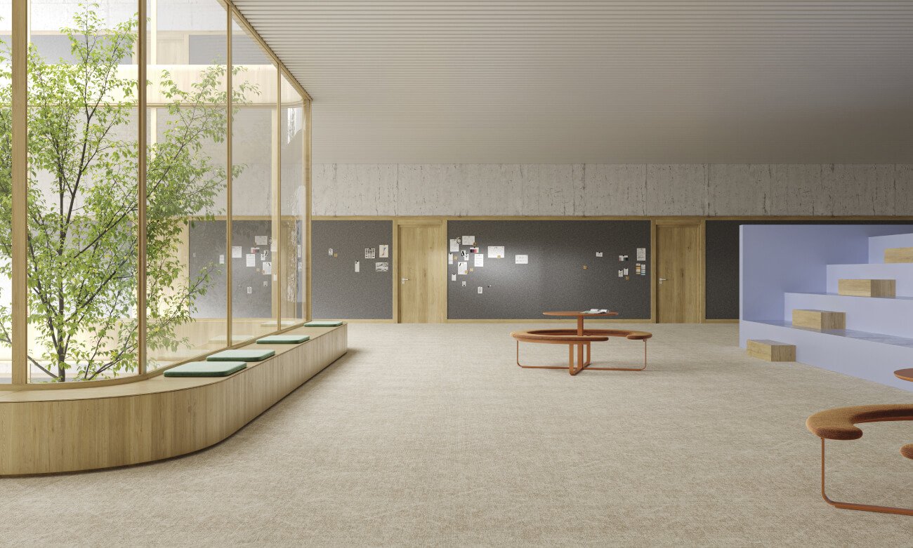 Alfombra modular que fusiona líneas geométricas dinámicas con un diseño sorprendente. Su patrón complementa la colección aportando versatilidad y movimiento visual a espacios comerciales. Certificada para uso profesional intensivo, ofrece alternativas creativas de composición modular mientras mantiene la durabilidad superior característica del diseño belga.