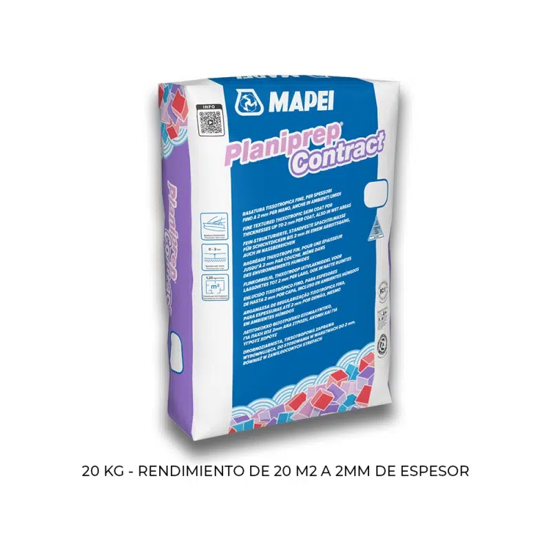 Cuando se mezcla Planiprep Contract con agua, se obtiene una pasta tixotrópica (de nulo deslizamiento) que puede ser fácilmente aplicada en muros y pisos. Es posible aplicarlo en espesores de hasta 2 mm por mano. Una vez seco, forma una superficie particularmente lisa, especialmente adecuada para la instalación de revestimientos resilientes o flexibles, con buena resistencia a la compresión, flexión, desgaste y abrasión.