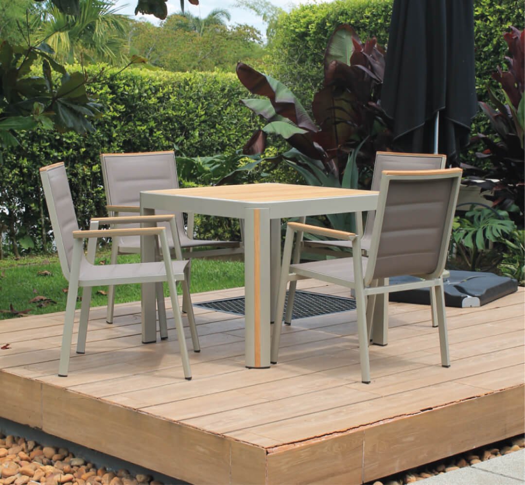 La mezcla perfecta entre la madera teca y el aluminio, crean un mueble que evoca naturalidad