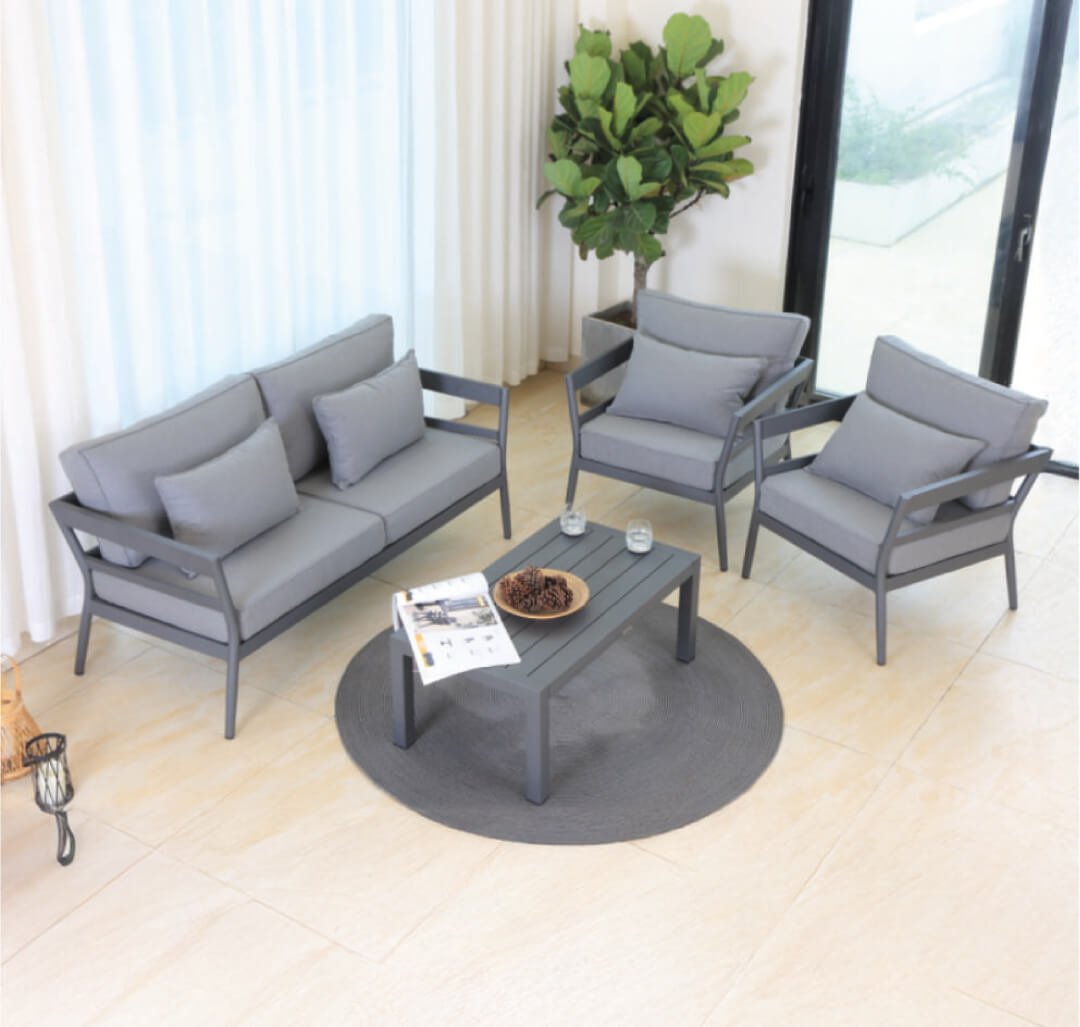 Explora nuestra línea de mobiliario para exteriores y crea ese ambiente que invita a quedarse: salas acogedoras, comedores modernos y piezas individuales que combinan estilo, comodidad y resistencia al clima.