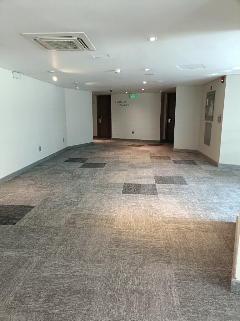 Se utilizaron alfombras modulares importadas de origen americano, en formato de 61 x 61 cm, referencia Arrange, combinando tonos gris claro y gris oscuro para generar un diseño dinámico, elegante y alineado con la identidad del espacio.